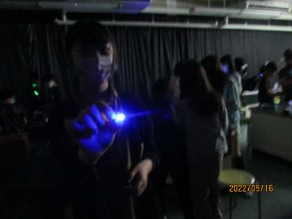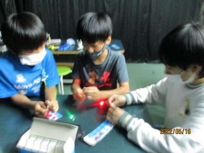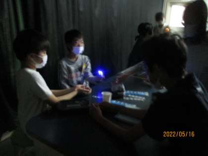 部屋を暗くして,LEDの明るさを確認。「おぉ〜!」と歓声が上がっていました。