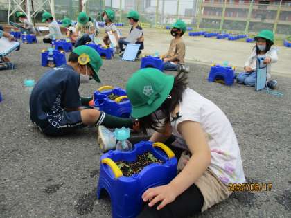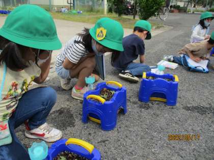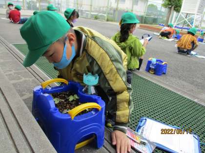 「葉っぱは何枚ですか?」先生の声掛けで,真剣に観察していました。