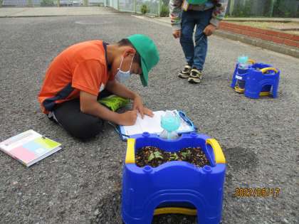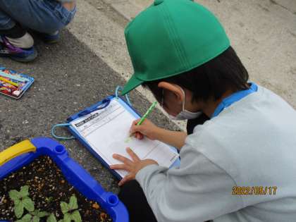 観察シートに芽の絵を描き込んでいました。自分が育てているアサガオだけに,愛着ありますよね♪