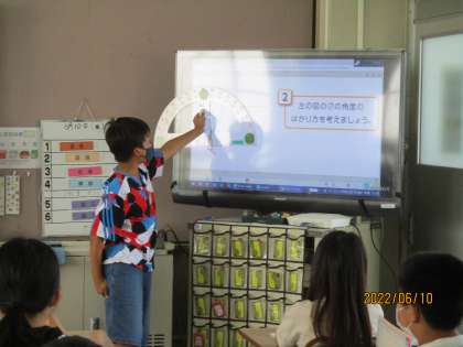 前で一生懸命説明していました。「180度を超えた角度を測る」という未知との遭遇を楽しんでいる雰囲気が,教室から感じられます♪