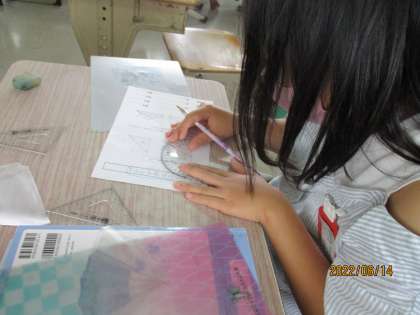 習いたての分度器を駆使して,三角定規の角度を測っています。