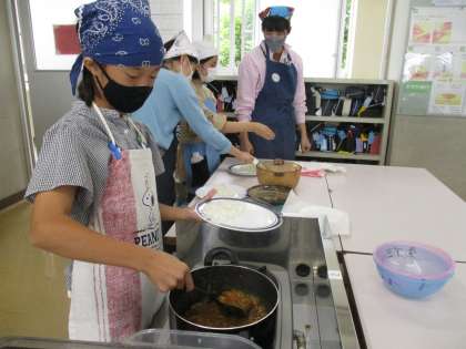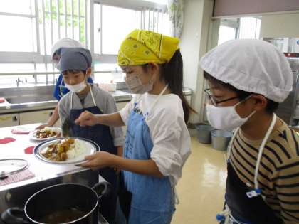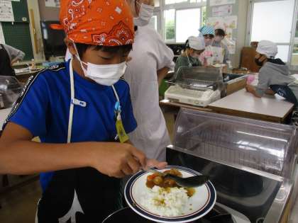 お皿にご飯を盛ったら,カレーをかけて,出来上がり!