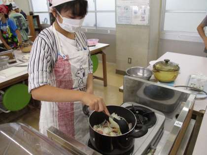 玉ねぎに火が通るまで炒めましょう。ほんのり良い香りが家庭科室に充満していました。