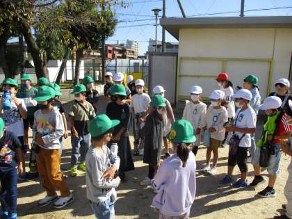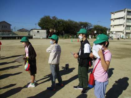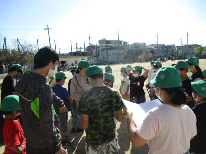 快晴の下,今日の「たてわり活動」がスタート。6年生のリーダーが下級生に話をしていました。