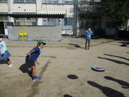10月14日(金)たてわり活動の様子 その9 公開日 2022/10/14 更新日 2022/10/14 全体行事 本校の子どもたち,フリスビーを投げるのが上手な人が多いです。「シュパッ!」っと投げています。