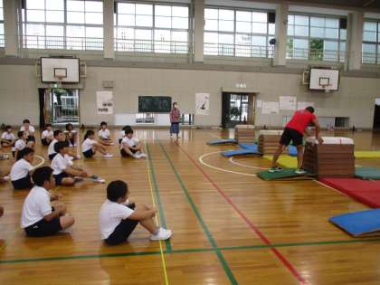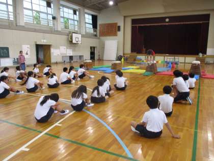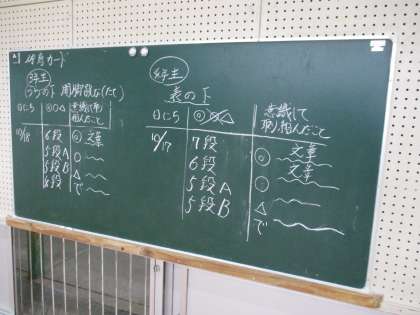 体育館での体育です。体育館内に黒板が設置されて,授業の見通しが示されていました。