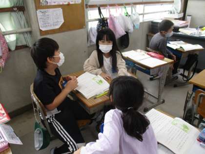 「かえるくん」は「なぜ,いそいでとびだしたのか?」。隣近所の人と話し合っています。