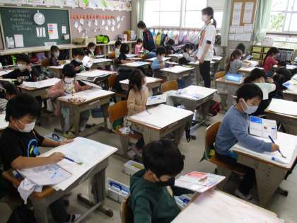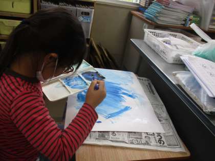 10月18日(火)授業の様子(1年)その5 公開日 2022/10/18 更新日 2022/10/18 1年生 十分に画用紙を濡らせたら,さぁ,色を塗りましょう。こちらは「あいいろ」を選んだ人たちです。