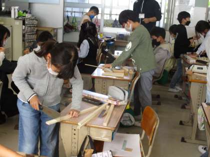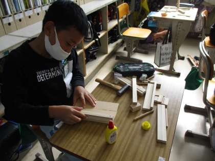 のこぎりで切り,釘打ちし,木工ボンドも駆使。思い描く作品ができあがるといいですね。