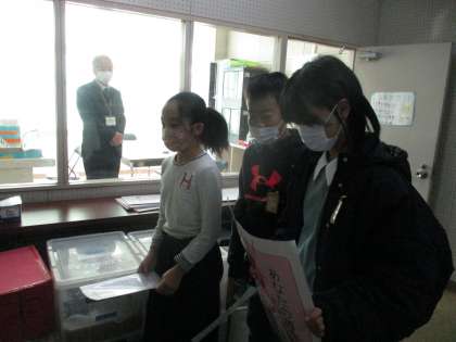 児童会から赤い羽根の募金活動への協力について,お礼の言葉を伝えていました。