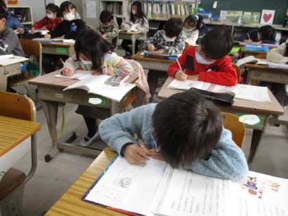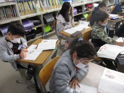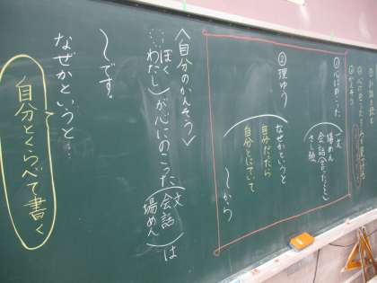 黒板に感想文の書き方の「型」が示されています。お話の中に書かれていることをもとに,上手に書けるでしょうか♪