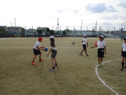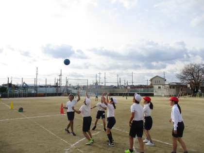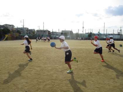運動場で体育。朝日の中,今日も元気に走り回りましょう!