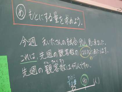 「もとにする量を求めよう」が本日のめあて。割合で一番難しいところですよね。