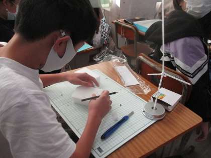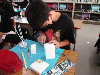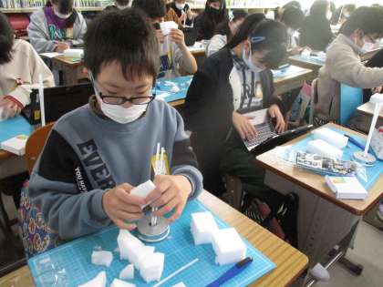 発泡スチロールをカッターで切り,ストローに差して… イメージ通りにできるか,楽しみですね♪