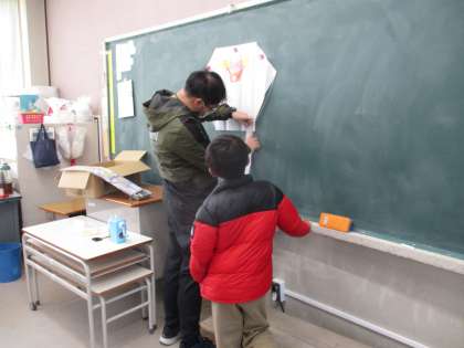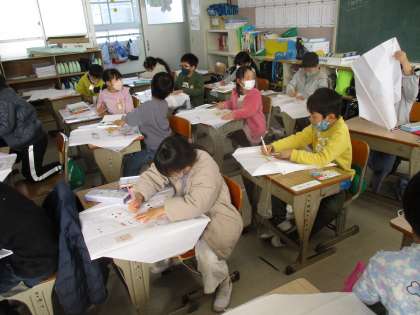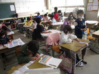 生活の時間です。凧作りに取り組んでいました。