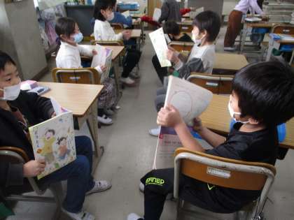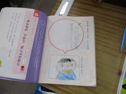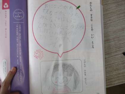 教科書のワークに書き込んだ自分の似顔絵とすきなこと。しっかり伝えられるでしょうか。
