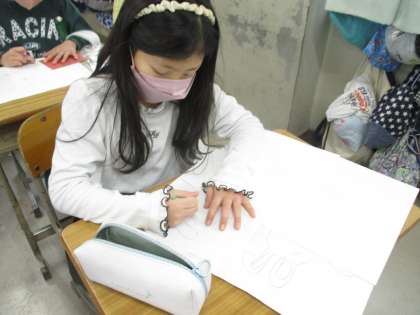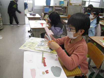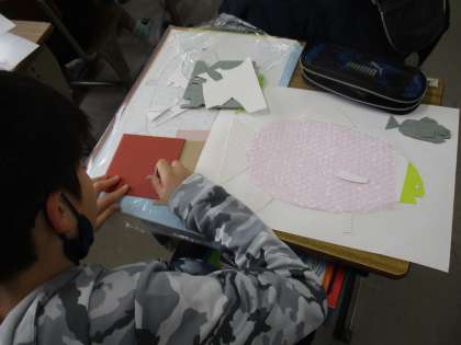 下絵を描いたら,作品に凹凸をつけるために,色々な素材を切って,貼って…