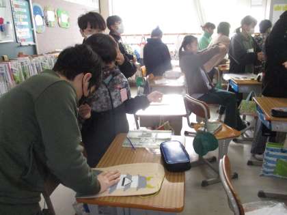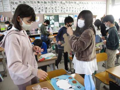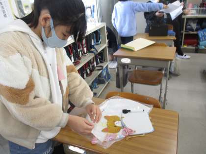 絵の出来上がった伝言板にひも等の付属品を取り付けていました。