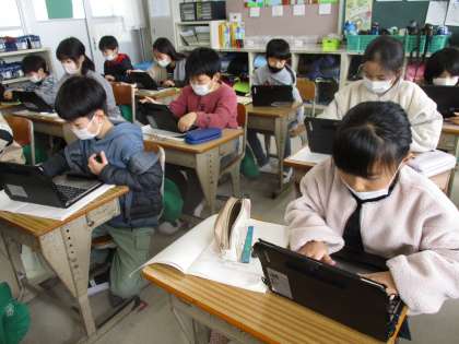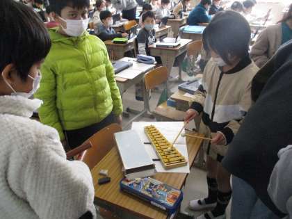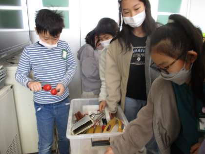 先生が準備してくれた楽器を実際に鳴らしています。検索で知識を得て、具体物で体験する。両方が大事♪