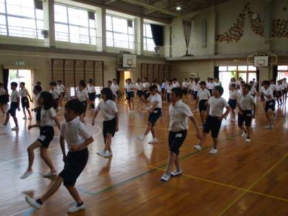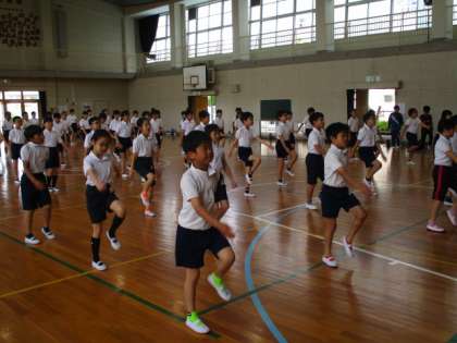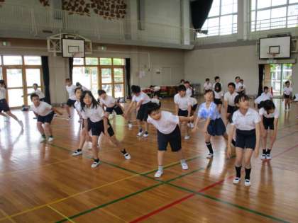 5年生が体育館で「新堺っ子体操」の練習です。細かい動きまでこだわると、なかなかの運動量ですね。
