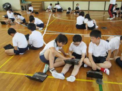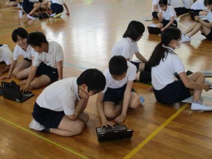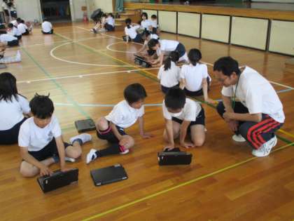 6年生が体育館で体育大会の練習をしています。何やら、ダンスをしているようすを友だち同士で動画撮影しているようです。撮影が終わると、友だちといっしょに動画を見てあれこれ話しています。良いところを見つけたり、アドバイスをしたり・・・どうすればよりよいダンスになるのかを考えていました。