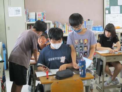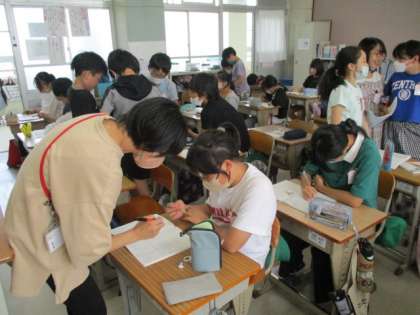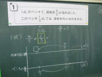 1組の算数です。「4/5×1/3」の答えの求め方を考えています。図や数直線などを使って、ノートに自分の考えをしっかり書いていました。