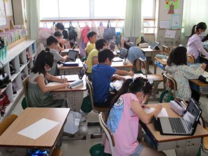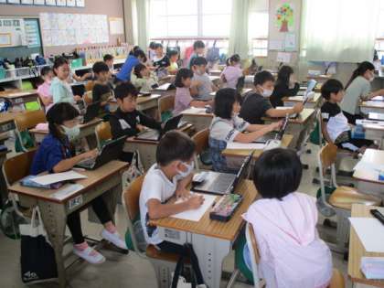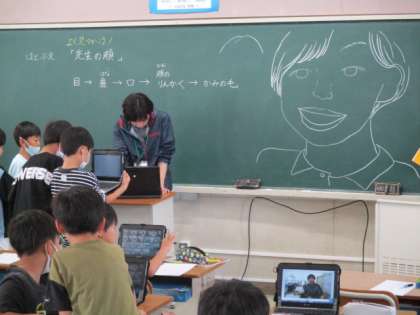 1組では、タブレットで撮影した先生の顔を描いていました。できた作品は「はとぶえ」に応募するようです。