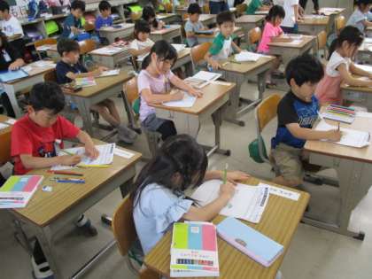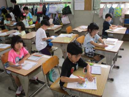 1組の生活科です。アサガオの観察記録を書いていました。ようやく本葉がでたようです。