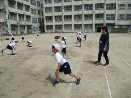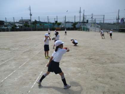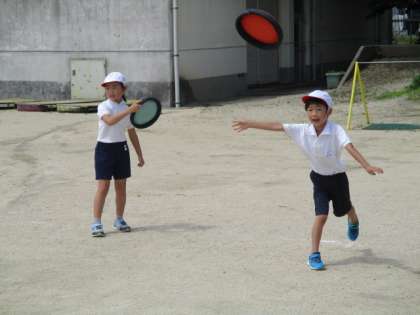 2組の体育です。ドッジビーをペアで投げ合っています。うまくキャッチできるかな?