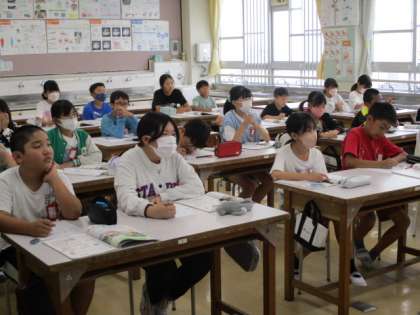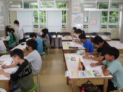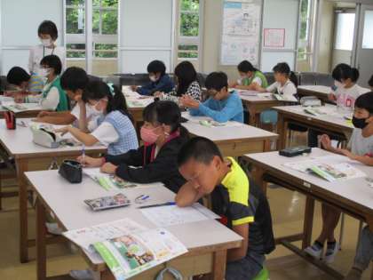 1組の家庭科です。手縫いにトライする前に、まずは裁縫セットに入っている用具の名前や使い方を学習します。