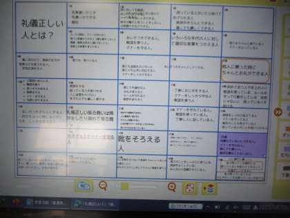 2組の道徳です。礼儀正しい人とはどんな人かを考え、タブレットに自分の考えを入力します。その後、グループで考えを交流し、共通点を見つけていました。タブレットを使った協働学習です。