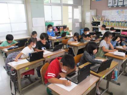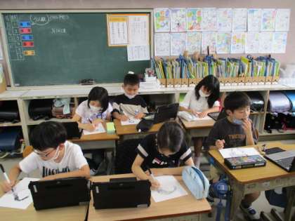 3組では、タブレットで撮影した先生の顔を見て、絵を描いています。「はとぶえ」に応募するようです。