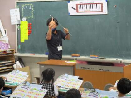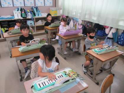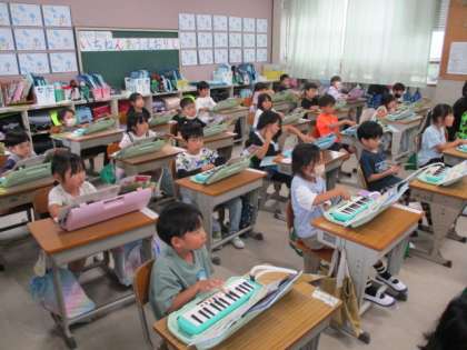 3組の音楽です。けんばんハーモニカで「ど」と「れ」の音だけで演奏です。まずは、親指と人差し指の使い方を練習します。
