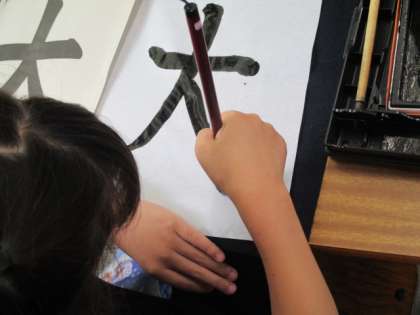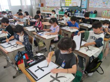 1組の書写です。今日は「大」という字を書いていました。「はらい」の筆づかいに気をつけて書きます。