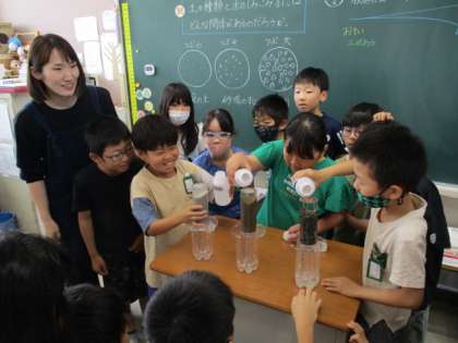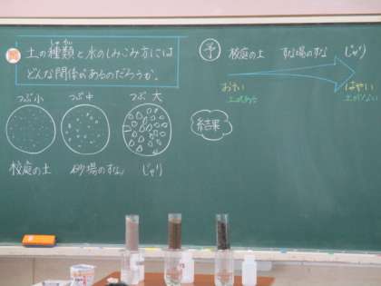 4年生の理科「地面を流れる水のゆくえ」の学習です。土の種類と水のしみこみ方の関係を 学習しています。校庭の土、砂場の砂、砂利をとってきて、実際に水をしみこませる実験をしていました。結果は砂利が圧倒的に水をよく通すことがわかります。