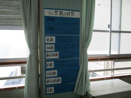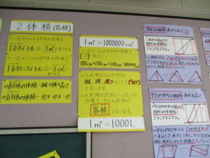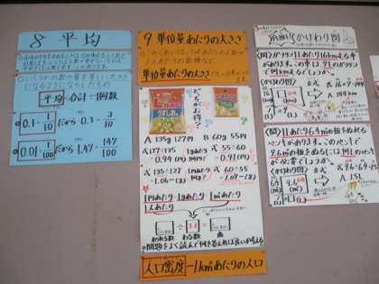 算数の少人数教室の横と後ろにはこんな掲示物があります。算数の既習事項の要点をまとめています。公式や用語、考え方を忘れてしまったときには、これを見ればいつでも思い出せますね。特別教室ならではの教室環境の工夫です。