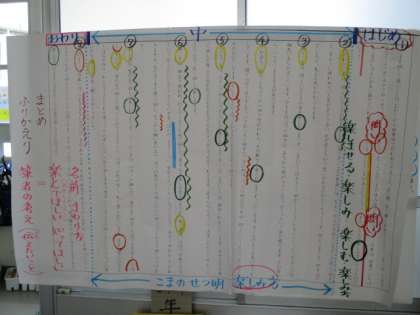 3年生の国語「こまを楽しむ」の全文掲示です。説明文は全体の構成をとらえることが大切ですが、教科書はページをめくるので、子どもたちにはとらえにくいものです。そこで、この「全文掲示」が効果を発揮します。既習事項がよくわかるだけでなく、説明文全体の構成がよくわかりますね。