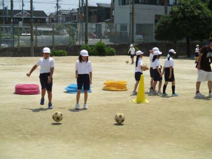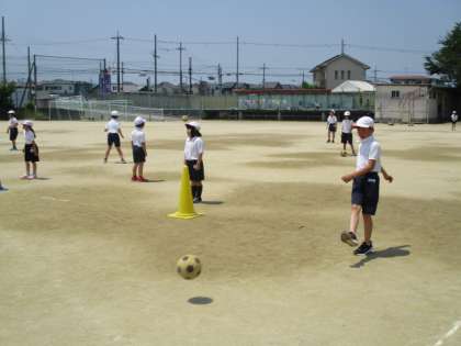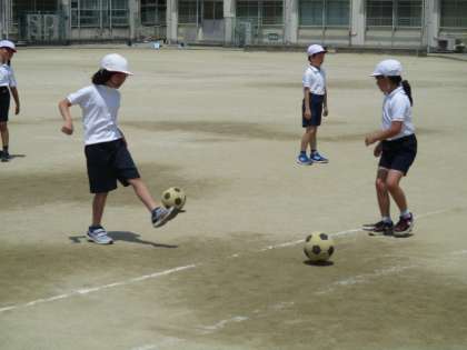 3組が運動場でサッカーをしています。2人組でパスの練習です。