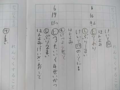 3組では、連絡帳を書いています。ひらがなが書けなかった子どもたちが、毎日連絡帳を書けるようになりました。子どもの成長にはいつも驚かされます。