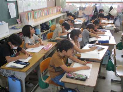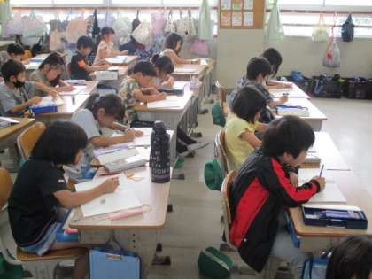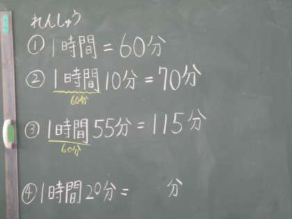 1組の算数です。時間を分に換算する学習です。60進法に慣れない子どもたちには、とても難しいところです。