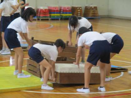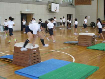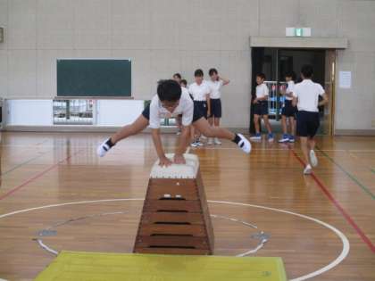 3組の体育です。跳び箱の練習です。6年生ともなると、7段の跳び箱を跳んでいます。