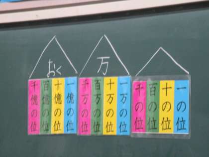3年生の大きい数の学習でこんなものを見つけました。新しく「一万、十万、百万、千万の位」を学習したところで、先生が提示しました。位を「4人家族の部屋」に例えて、「万の部屋」「億の部屋」なんて説明をしていました。また、4色に色分けもしてあります。位を理解するための、わかりやすい工夫ですね。