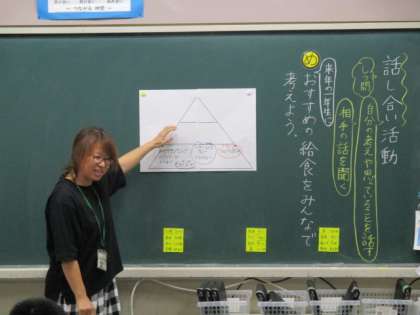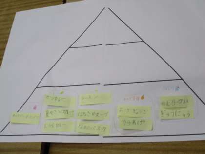3年生が国語の学習で話し合いをしています。テーマは、来年の1年生におすすめの給食についてです。話し合いを進めるツールとして、「ピラミッドチャート」という思考ツールを活用しています。一番下の段に、まず広く考えを出し合い、その上にはその中からよりふさわしいものを、さらに一番上に最もふさわしいものを、根拠を明確に選んでいきます。