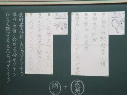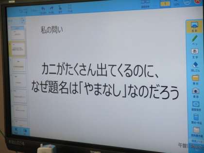 6年生の国語「やまなし」の板書です。子どもたちがタブレットに「私の問い」をまとめることが今日のゴールです。板書には、どのような見方・考え方で問いを見つければいいのかが書かれています。また、物語を読む前に、宮沢賢治の生い立ちなどについても学習し、価値ある「問い」をもつための準備もしていました。