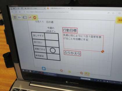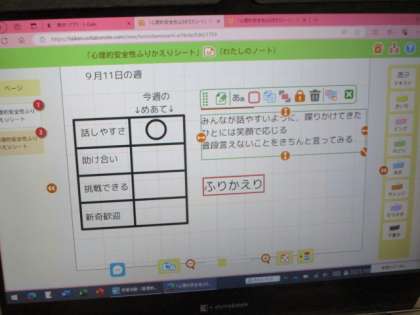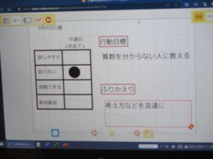 6年生の子どもたちが、タブレットで「今週のめあて」を入力しています。月曜日の朝には今週自分が取り組むことを具体的に決め、金曜日にふりかえるそうです。互いに認め合い、助け合い、対話によって高めあうクラスにするために、大切にしたい4つの観点(話しやすさ、助け合い、挑戦できる、新奇歓迎)について、一人一人が自分を高める取り組みです。