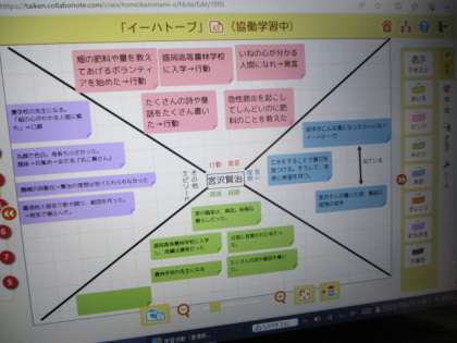 そこで、この「Xチャート」の出番です。宮沢賢治の「行動・発言」「思想・思い」「環境・経験」「その他エピソード」の4つの観点に整理していきます。子どもたちはタブレット上で読みとったことを整理していきました。