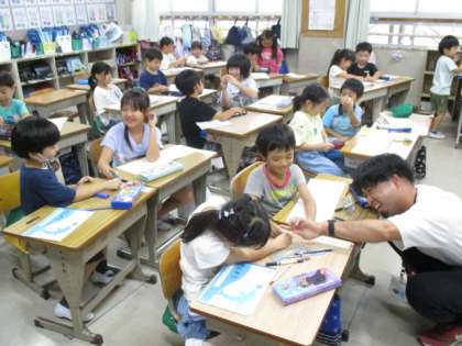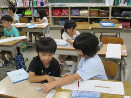 3組の算数「ながさ」の学習です。友だちと持ち物の長さを比べる「ながさくらべたいかい」をしていました。けしごむや赤鉛筆の長さを比べる経験を通して、楽しみながら「直接比較」について学びます。