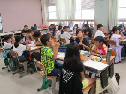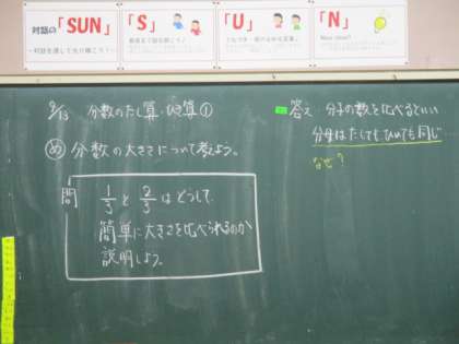 1組の算数です。分数のたし算・ひき算の学習ですが、今日は分数の大きさについて考え、話し合っていました。