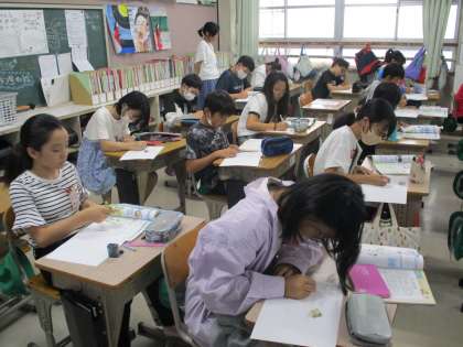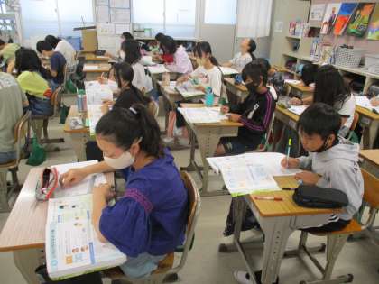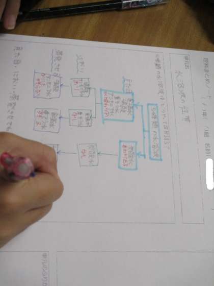 1組の理科です。「水溶液の性質」の学習をふりかえり、自分でまとめノートを作成しています。