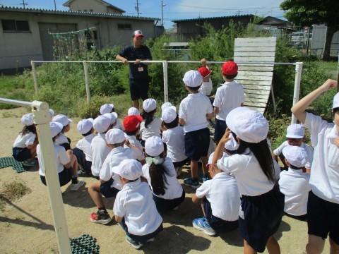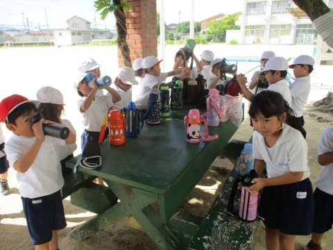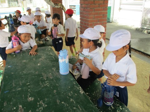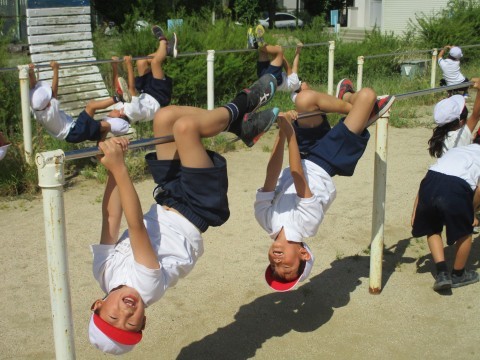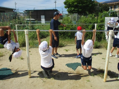 1組の体育です。残暑が厳しく,なかなか外で体育ができない日が続いていましたが,今日は少しさわやかな天気で,外で運動できました。こどもたちもうれしそうに鉄棒運動を楽しんでいましたよ。